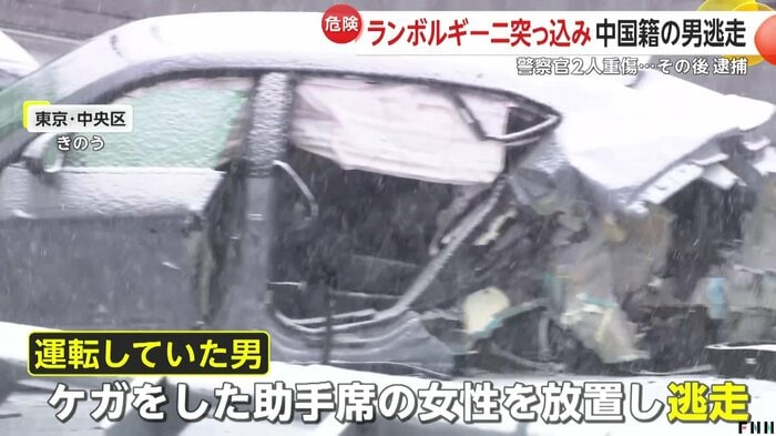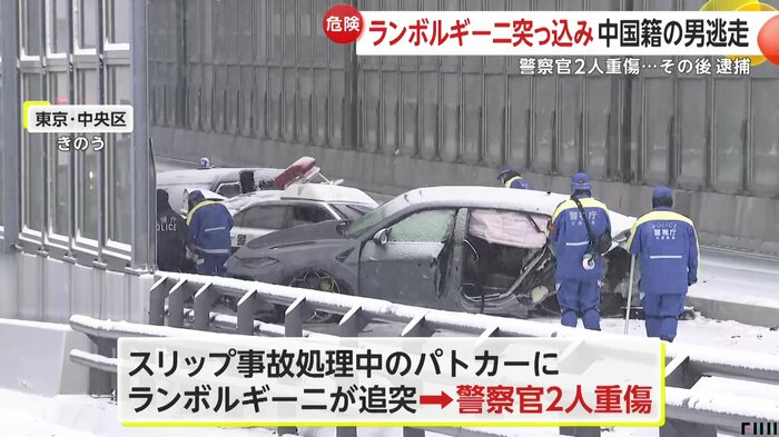 東京・中央区ではスリップ事故を処理していたパトカーに、イタリアの高級車ランボルギーニが突っ込み、警察官2人が重傷を負った。