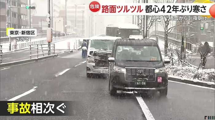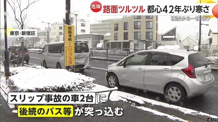 東京・新宿区の山手通りではスリップ事故を起こした2台の車に後続のバスなどが突っ込んだ。
