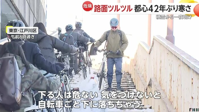 9日午前8時過ぎに東京・江戸川区の歩道橋を上がると、かなり雪が残っていて、一部が凍結しており、人々が自転車を降りてゆっくり押しながら歩く姿が見られた。