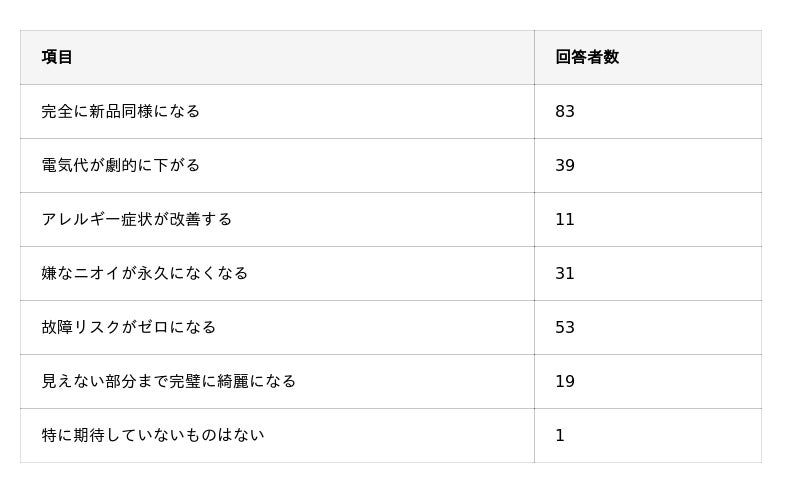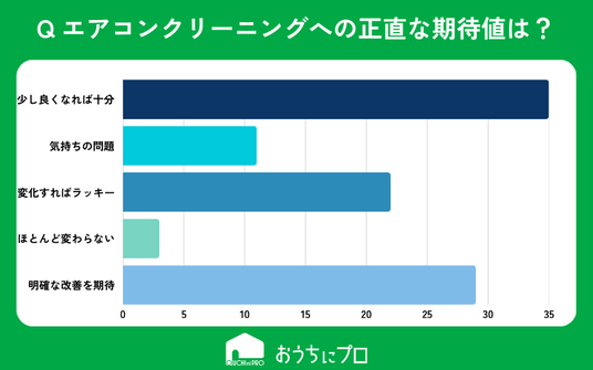 - エアコンクリーニングへの期待値は「少し良くなれば十分」と考える人もいれば「明確な改善を期待している」人も多くいる。