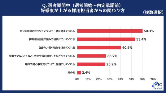 「選考期間中(選考開始~内定承諾前)、採用担当者からどのような関わり方をされると好感度が上がりますか?あてはまるものをすべて選択してください」と質問したところ、「自分の将来のキャリアについて一緒に考えてくれる」が60.3%、「就職活動全般の悩みや相談にのってくれる」が53.4%、「自分の人柄や強みをほめてくれる」が40.5%、「学業やアルバイトなど、大学生活の頑張りをねぎらってくれる」が26.7%、「趣味や関心事を覚えていて、話題にしてくれる」が25.9%、「その他」が3.4%となりました。
