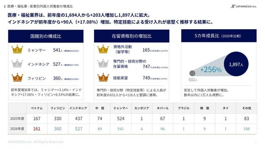 医療・福祉分野では、外国人労働者数が前年度の1,694人から203人増加し、1,897人となりました。慢性的な人手不足が続く中、介護・医療現場を中心に外国人材の受け入れが着実に進んでいます。