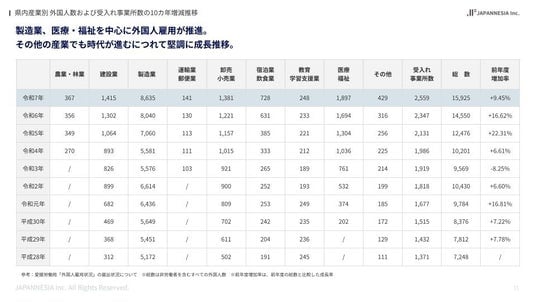 【令和7年度】愛媛県の産業別外国人の10カ年増減推移