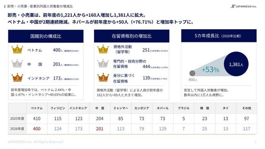 国籍構成に変化の兆し、2強構造からインドネシア・ネパール・ミャンマーなどの国籍の分散化が進行