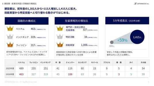 建設業では、外国人労働者数が前年度の1,302人から113人増加し、1,415人となりました。