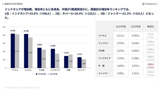 また、前年度からの増加数・増加率ではインドネシアがトップとなり、+588人(+33.6%) と急成長。次いでネパール・ミャンマーなど国籍の分散化が進む結果となりました。