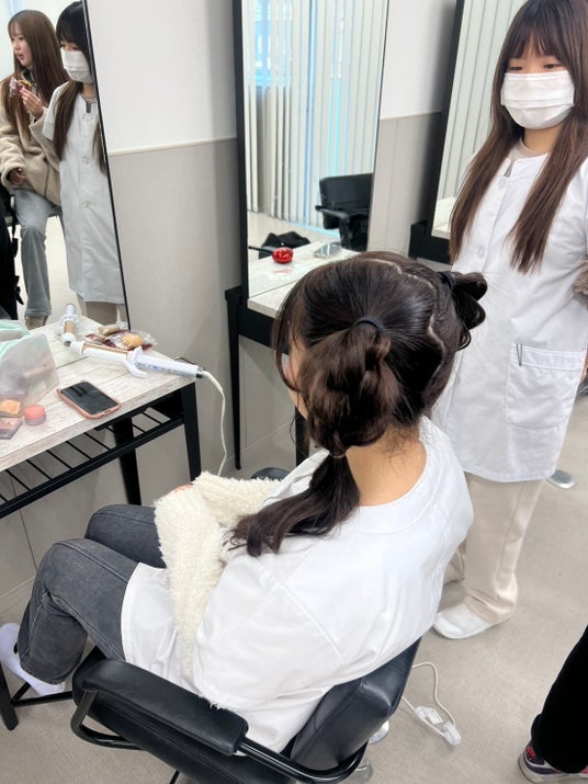 ・ 施術の現場:学生がアイドルのヘアメイクを行う手元の緊張と集中、施術後に見せる安堵の笑顔が印象的でした。