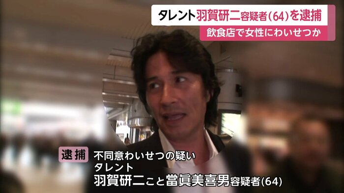 不同意わいせつの疑いで逮捕されたのは、沖縄・北谷町に住むタレントの羽賀研二、本名・當眞美喜男容疑者(64)。