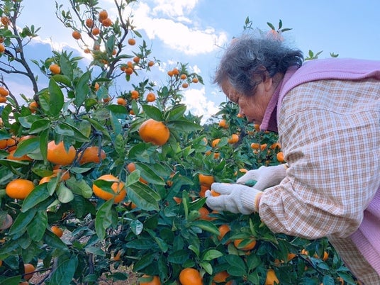静岡県沼津市西浦のみかん畑でみかんを収穫する曾祖母