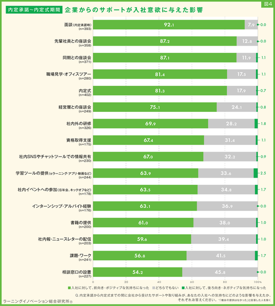 結果、「入社に対して、前向き・ポジティブな気持ちになった」と回答した割合は、「面談(内定承諾時)」のサポートを受けた内定者が最も高く、92.1%が回答しました。次に、「先輩社員との座談会」が87.2%、「同期との座談会」は87.1%、「職場見学・オフィスツアー」は81.4%、「内定式」は81.3%と続きました。