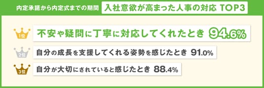 結果、入社意欲が高まったと内定者が回答した割合が最も高かったサポートは、「不安や疑問に丁寧に対応してくれたとき」で、94.6%でした。次に、「自分の成長を支援してくれる姿勢を感じたとき」が91.0%、「自分が大切にされていると感じたとき」が88.4%と続きました。