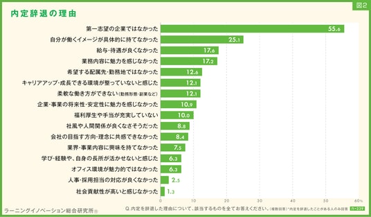 結果、「第一志望の企業ではなかった」と回答した人が55.6%で、半数以上が、就職活動期間中に設定した第一志望の企業かどうかを、入社先企業を選ぶ際に重視していることがうかがえます。次に、「自分が働くイメージが具体的に持てなかった」(25.1%)、「給与・待遇が良くなかった」(17.6%)が続きました(図2)。