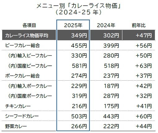 2025年のカレーライス物価平均は1食349円(前年302円)となった。