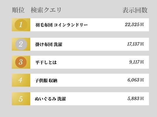 検索クエリを見ると、「羽毛布団 コインランドリー(22,325回)」「掛け布団 洗濯(17,137回)」「平干しとは(9,117回)」「ぬいぐるみ 洗濯(5,883回)」など、“家で洗っていいのか迷う洗濯物”に関する検索が多く寄せられています。