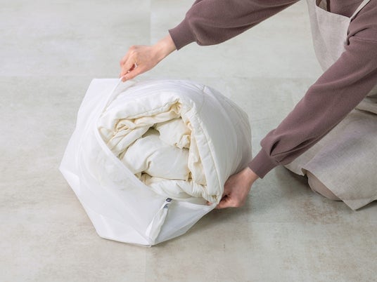 ポイントは、洗濯中に布団が暴れすぎないようにし、水流や摩擦をコントロールすること。全体を包み込むように洗うことで、直接ドラムや洗濯槽に当たる衝撃を減らし、型くずれや中綿の片寄りを防ぎやすくなります。