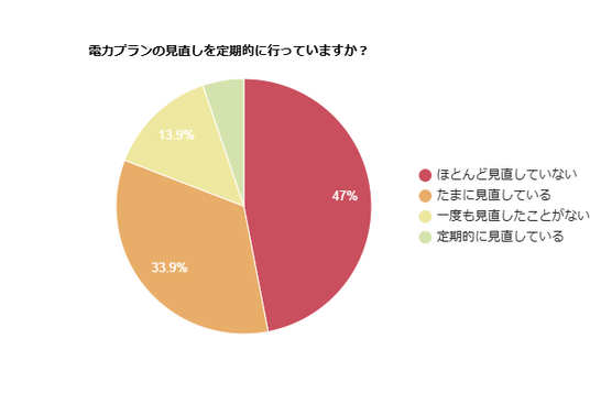 電力プランの見直しをしているかアンケートを実施したところ、「ほとんど見直していない」と回答した人が47%でした。「一度も見直したことがない」と回答した人も13.9%となっており、多くの人が見直しには消極的なことが分かりました。