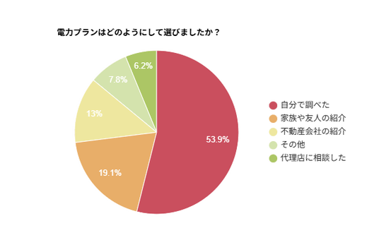 契約するプランを「自分で調べた」と回答した人が53.9%で最も多い結果となりました。電力自由化以降、ユーザー自身がWeb検索や比較サイトを用いて能動的に選ぶスタイルが定着しています。 次いで「家族・友人の紹介」(19.1%)や「不動産会社の紹介」(13%)といった第三者の推奨が続いています。