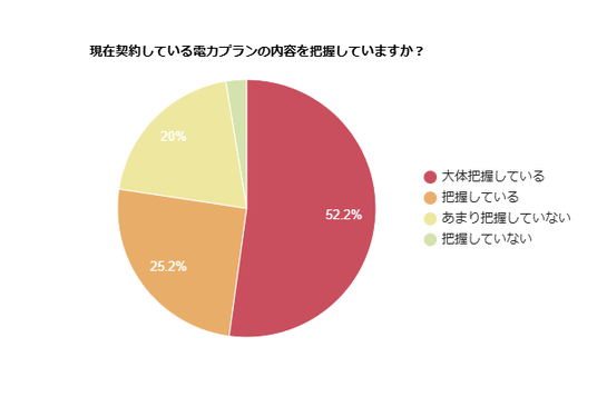 契約中の電力プランについて、「把握している」(25.2%)と「大体把握している」(52.2%)と回答した人を合わせると約8割が把握していることが分かりました。一方で、あまり把握していない人も一定数おり、人によって差があることがうかがえます。