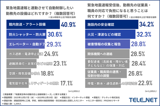 テレネット株式会社(所在地:長野県飯田市、代表取締役:青山 貴子)は、工場、学校、病院の施設管理者・防災担当者を対象に、「地震発生時の初動対応と自動制御ニーズ」に関する調査を実施しました。