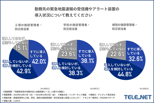 そこで今回、地震情報をより早いタイミングで、正確にお知らせする緊急地震速報機「ハザードプロ」(https://telenet.co.jp/hazardpro/)を提供しているテレネット株式会社は、工場、学校、病院の施設管理者・防災担当者を対象に、「地震発生時の初動対応と自動制御ニーズ」に関する調査を実施しました。