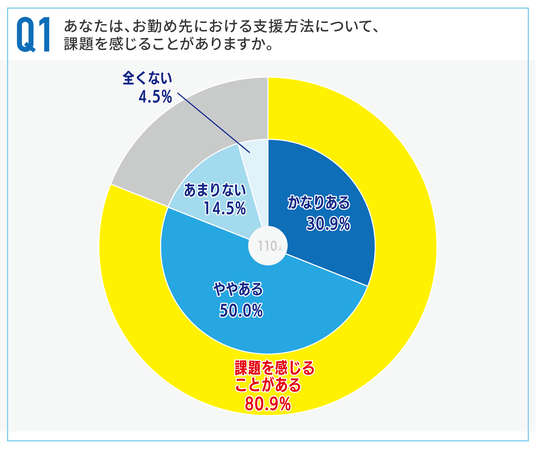 「お勤め先における支援方法について、課題を感じることがありますか」と伺うと、「かなりある」が30.9%、「ややある」が50.0%となり、合わせると80.9%の支援者が現状の支援方法に課題を抱いていることが分かりました。