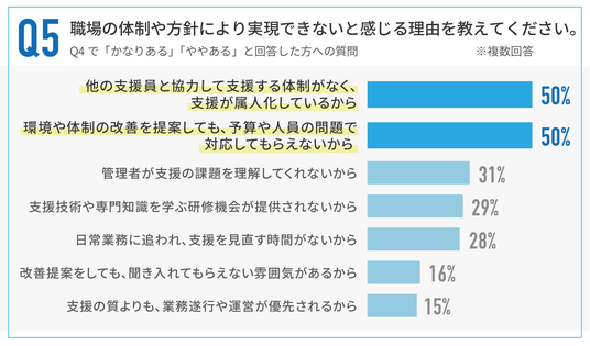 改善が困難な理由を伺うと、「支援が属人化しているから(50%)」と「予算や人員の問題(50%)」が同率で最多となりました。