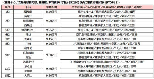 【調査対象駅】SUUMOに掲載されている日吉駅まで15分以内、田町駅・三田駅・赤羽橋駅いずれかまで20分以内の駅(掲載物件が20件以上ある駅に限る)