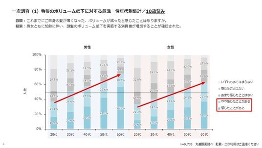男女ともに加齢に伴い、頭髪のボリューム低下を実感する消費者が増加すること及びその割合が確認されました。