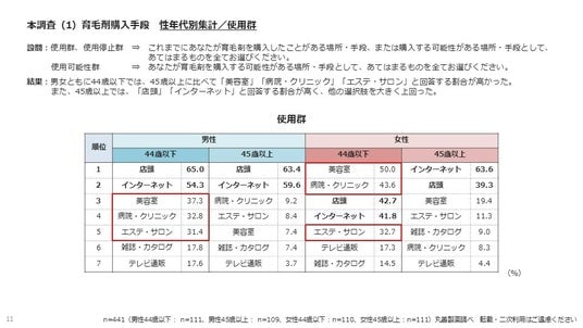 使用群の男女ともに44歳以下では、45歳以上に比べて「美容院」「病院・クリニック」「エステ・サロン」と回答する割合が高い結果となりました。また、45歳以上では「店頭」「インターネット」と回答する割合が高く、他の選択肢を大きく上回りました。