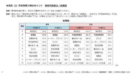 次いで、男性では「医薬品」、女性では「天然由来成分」が2位。また、男女問わず44歳以下では、45歳以上に比べて「低エタノール」と回答した割合が高くなりました。
