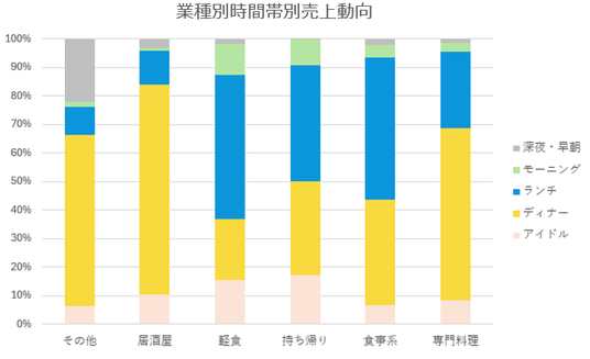 - 業種別時間帯別売上動向を見ると、1月度でディナータイムの売上割合が一番多いのは居酒屋、次に専門料理となりその差は13.2ptとなった。一方ランチタイムの売上割合が一番高いのは、軽食、次に食事系となり、その差は0.5ptとなった。