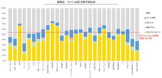 集計内容:飲食店 ジャンル別 キャッシュレス決済方法比率、キャッシュレス決済比率(内訳)