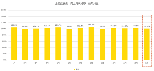 1月度売上は前年対比101.1%と前月から1.4pt減少した
