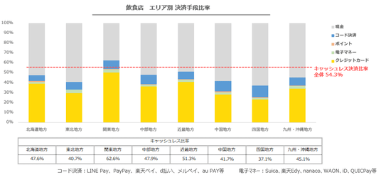 - 業態別にキャッシュレス比率を見ると、すべての業態で40%を超える。またコード決済比率が一番高い「持ち帰り」では、その割合が15.6%であった。