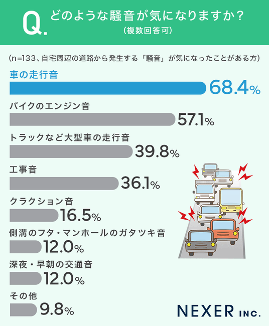 また「工事音」(36.1%)や「クラクション音」(16.5%)、「側溝のフタ・マンホールのガタツキ音」(12.0%)なども挙げられており、道路騒音の種類は多岐にわたることがわかります。