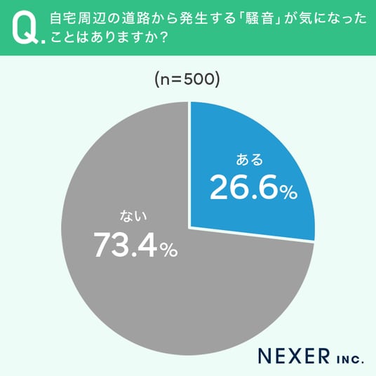 その結果「ある」と回答した人は26.6%、「ない」と回答した人は73.4%となりました。およそ4人に1人が、自宅周辺の道路騒音を気にした経験があることがわかります。