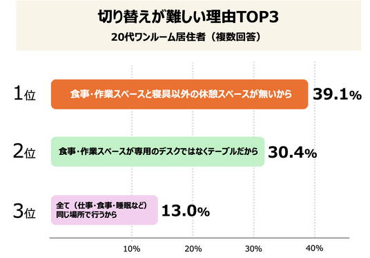 ・20代ワンルーム居住者の約半数(46%)が「同じ部屋での食事・作業・睡眠」に気持ちの切り替えが難しい