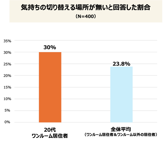 自宅の中で「一番気持ちを切り替えられる場所」を聞いたところ、20代ワンルーム居住者の30%が「切り替えられる場所はない」と回答しました。これは全体平均(23.8%)よりも高く、若年層の居住スペースに「メンタルの避難所」を持てずにいる現状が明らかになりました。