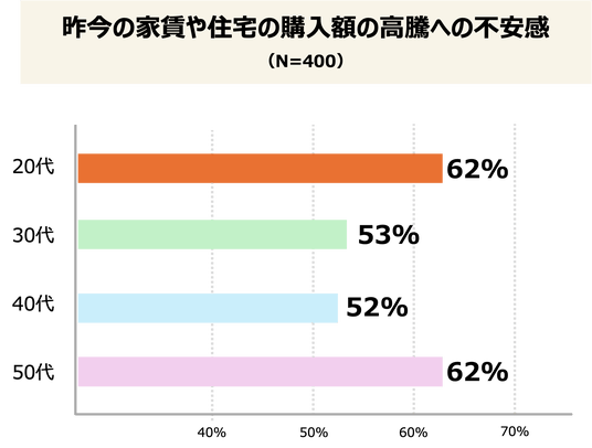 現在の住居に関して、「空間・スペース的なストレスの有無」を聞いたところ、ワンルーム居住者の40%がストレスを感じていると回答。さらに、昨今の家賃や住宅の購入額の高騰についてアンケートを取ると、全体の半数以上(57.3%)が不安に感じており、世代別にみると20代と50代のおよそ3人に2人(62%)が不安に感じていることが分かりました。