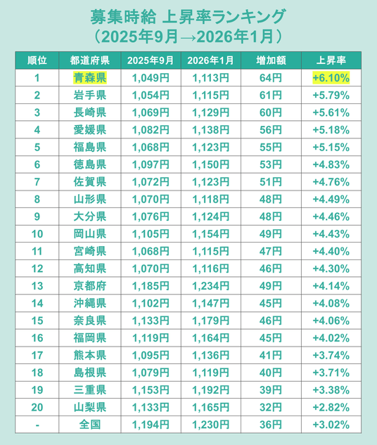 募集時給の全国平均は2025年9月から2026年1月にかけて+3.02%上昇し、最低賃金引き上げの影響が持続して表れています。特に青森県や岩手県、長崎県などでは全国平均を大きく上回る上昇率を記録しており、最低賃金改定が募集時給の水準に強く影響していることが分かりました。一方で、新最低賃金に対する上乗せ額には地域差も確認されています。