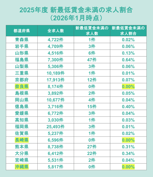 一方で、2026年1月1日に改定を行った熊本県、大分県、福島県、徳島県では相対的に最低賃金未満の求人割合が高く、改定直後の調整が続いている様子もうかがえました。