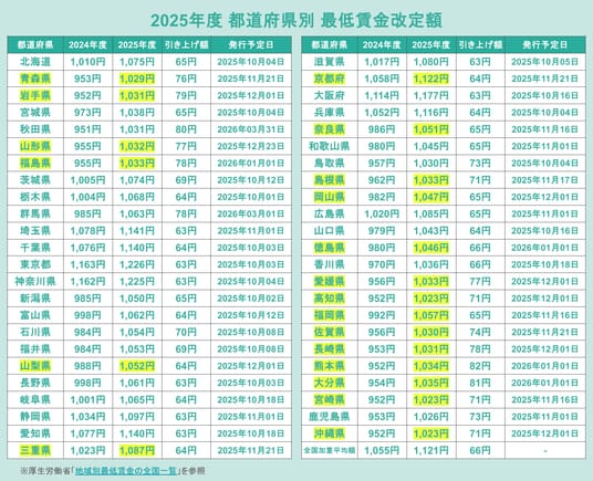 厚生労働省が発表した「地域別最低賃金の全国一覧」によると、2025年度の最低賃金引き上げ額の幅は63円~82円となりました。