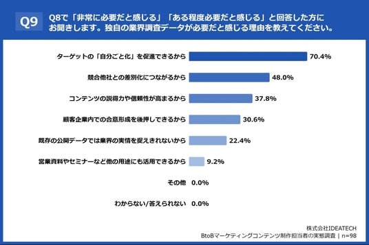 「Q9. Q8で「非常に必要だと感じる」「ある程度必要だと感じる」と回答した方にお聞きします。独自の業界調査データが必要だと感じる理由を教えてください。(複数回答)」(n=98)と質問したところ、「コンテンツの説得力や信頼性が高まるから」が37.8%、「ターゲットの「自分ごと化」を促進できるから」が70.4%、「競合他社との差別化につながるから」が48.0%という回答となりました。