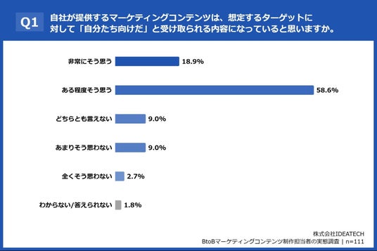 「Q1. 自社が提供するマーケティングコンテンツは、想定するターゲット(業界・職種・状況など)に対して「自分たち向けだ」と受け取られる内容になっていると思いますか。」(n=111)と質問したところ、「非常にそう思う」が18.9%、「ある程度そう思う」が58.6%、「どちらとも言えない」が9.0%という回答となりました。