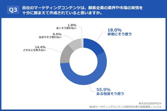 「Q3. 自社のマーケティングコンテンツは、顧客企業の業界や市場の実情を十分に踏まえて作成されていると思いますか。」(n=111)と質問したところ、「非常にそう思う」が18.0%、「ある程度そう思う」が55.9%、「どちらとも言えない」が14.4%という回答となりました。