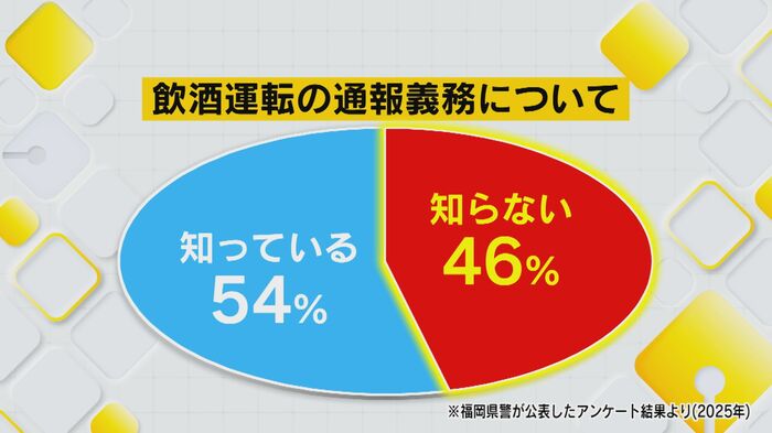 福岡県警によると、2025年に寄せられた飲酒運転に関する通報は、約2500件。そのうちの1割ほどが検挙に繋がった。しかし、県警が公表したアンケート結果では、飲酒運転の通報義務について、県民の半数が「知らない」と答え、認知度をいかに高めるかが、課題となっている。