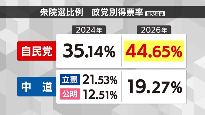 3区の比例の開票結果を見ると、すべての自治体で自民党が最も多くの票を獲得、中道と比べると薩摩川内市で8000票以上、姶良市では約6500票の差がついた。