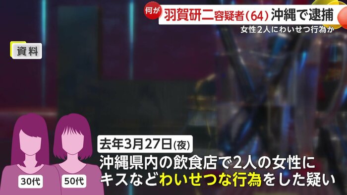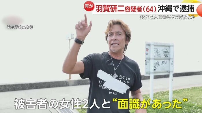 羽賀研二こと當眞美喜男容疑者は、沖縄県の飲食店で30代の女性と50代の女性に対し、キスをしたり体を触るなどのわいせつな行為をした疑いが持たれている。