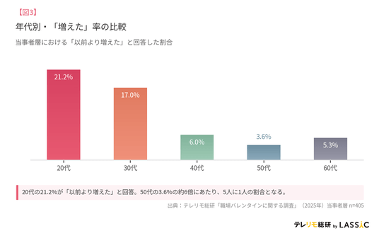 株式会社LASSIC(ラシック)(本社:東京都港区、本店: 鳥取県鳥取市、代表取締役社長: 若山幸司、以下「LASSIC」)が運営する、「場所に依存しない働き方」を推進・支援する情報を発信するWEBメディア「テレワーク・リモートワーク総合研究所(テレリモ総研)」は、リモートワーク経験者1,009名を対象に「職場バレンタインに関する調査」を実施した。職場でバレンタインギフトを渡す習慣を持つ当事者層405名を分析した結果、20代の67.3%が職場バレンタインを継続しており、60代の15.8%と比較すると約4倍にあたる。さらに20代の21.2%、つまり5人に1人が「以前より増えた」と回答しており、若手世代において職場バレンタインが拡大している層が存在することが示された。