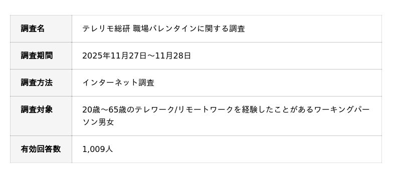 テレリモ総研が2025年8月に実施した別の調査(n=1,004)では、フル出社のメリットとして「上司・同僚・部下との信頼関係を築きやすい」が34.6%で1位となっている*1。出社機会が関係構築の場として認識されていることを踏まえると、限られた出社日を活用してバレンタインギフトを渡す行動とも整合する。